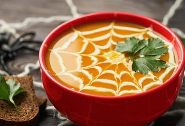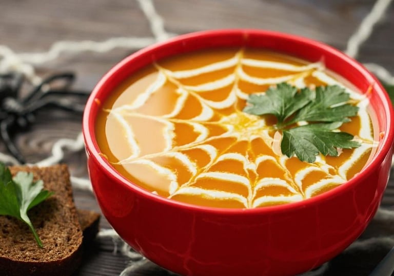 A creamy tomato soup with a twist — a web of sour cream that’s both creepy and delicious.